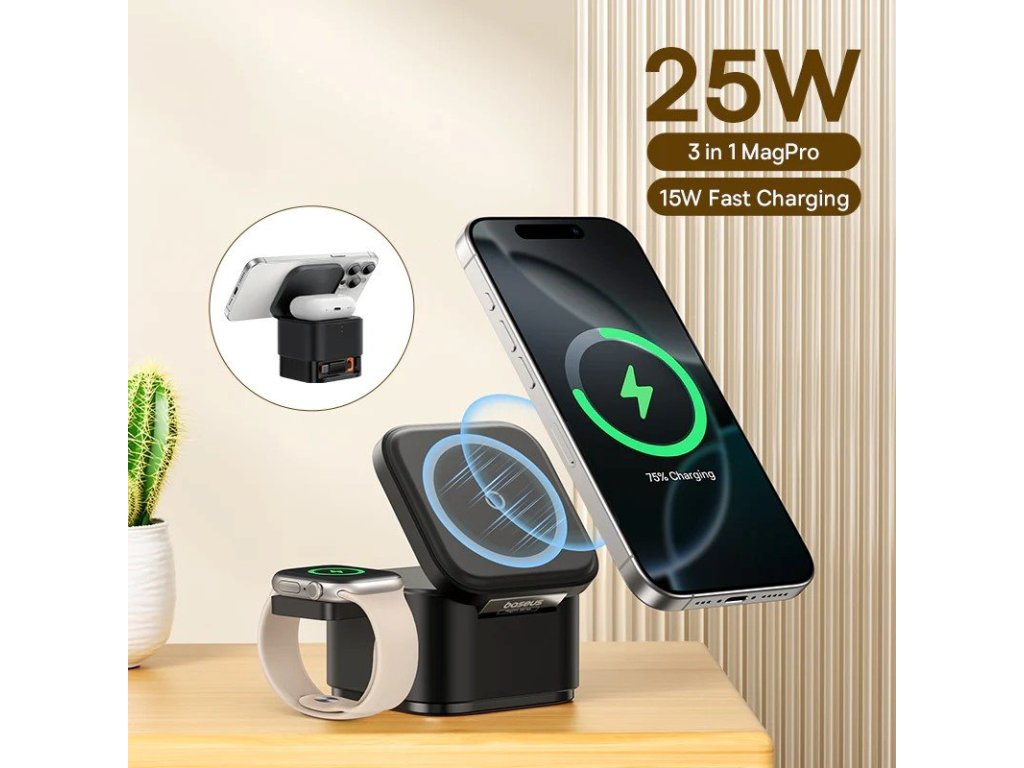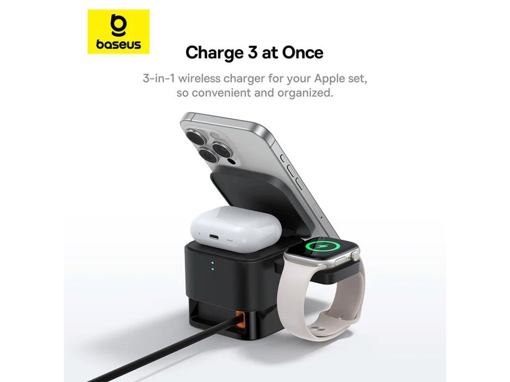 Baseus MagPro je praktická a stylová nabíjecí stanice určená pro současné bezdrátové nabíjení až tří zařízení najednou – chytrého telefonu, bezdrátových sluchátek a chytrých hodinek.Díky svému kompaktnímu a elegantnímu designu perfektně zapadne na pracovní stůl, noční stolek i kamkoliv na cesty.