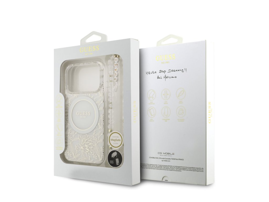 Guess IML Flowers Allover Strap MagSafe Zadní Kryt pro iPhone 17 Pro White