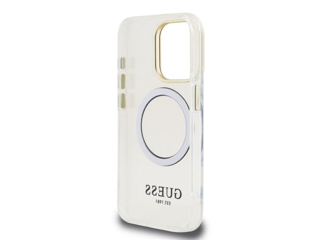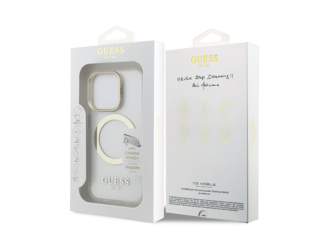 Guess IML Gold Outline Stand Camera Frame MagSafe Zadní Kryt pro iPhone 15 Pro Max Transparent