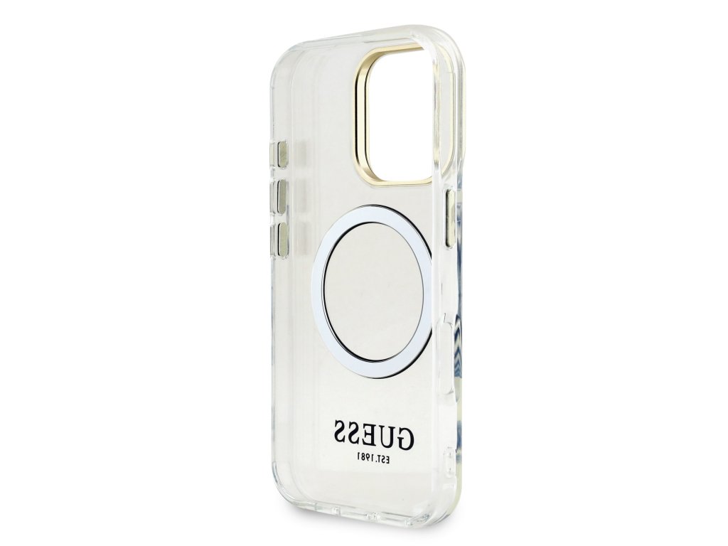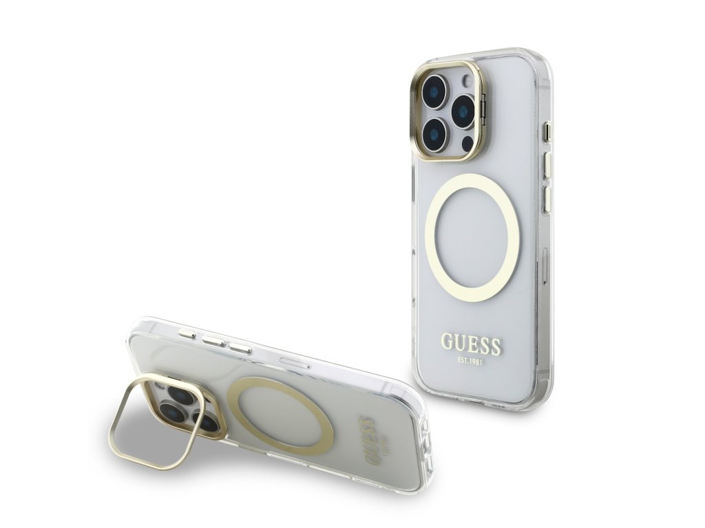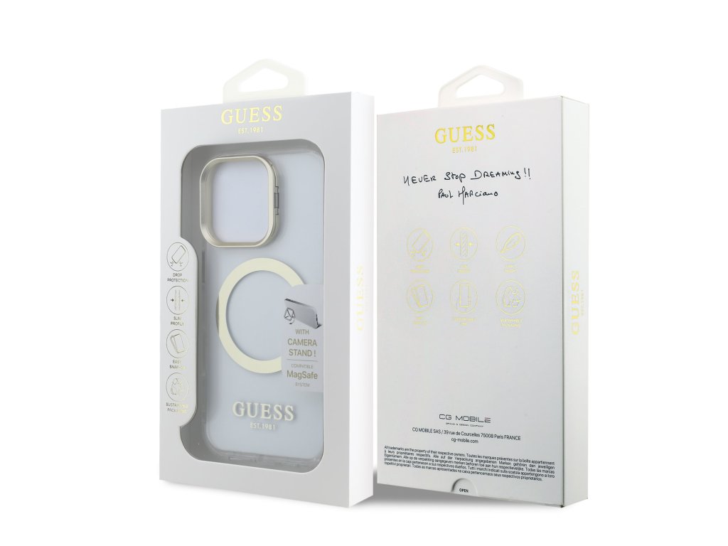 Guess IML Gold Outline Stand Camera Frame MagSafe Zadní Kryt pro iPhone 16 Pro Max Transparent