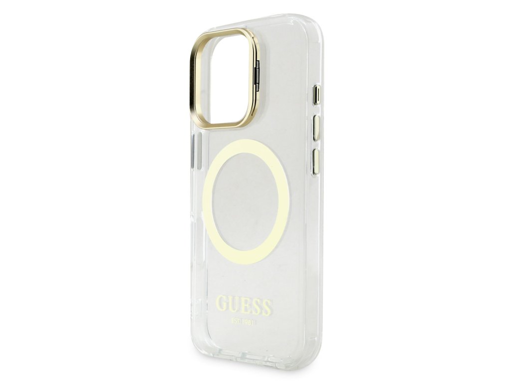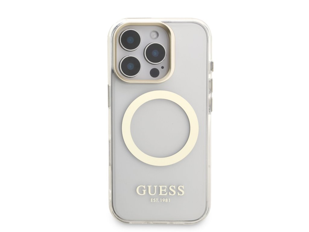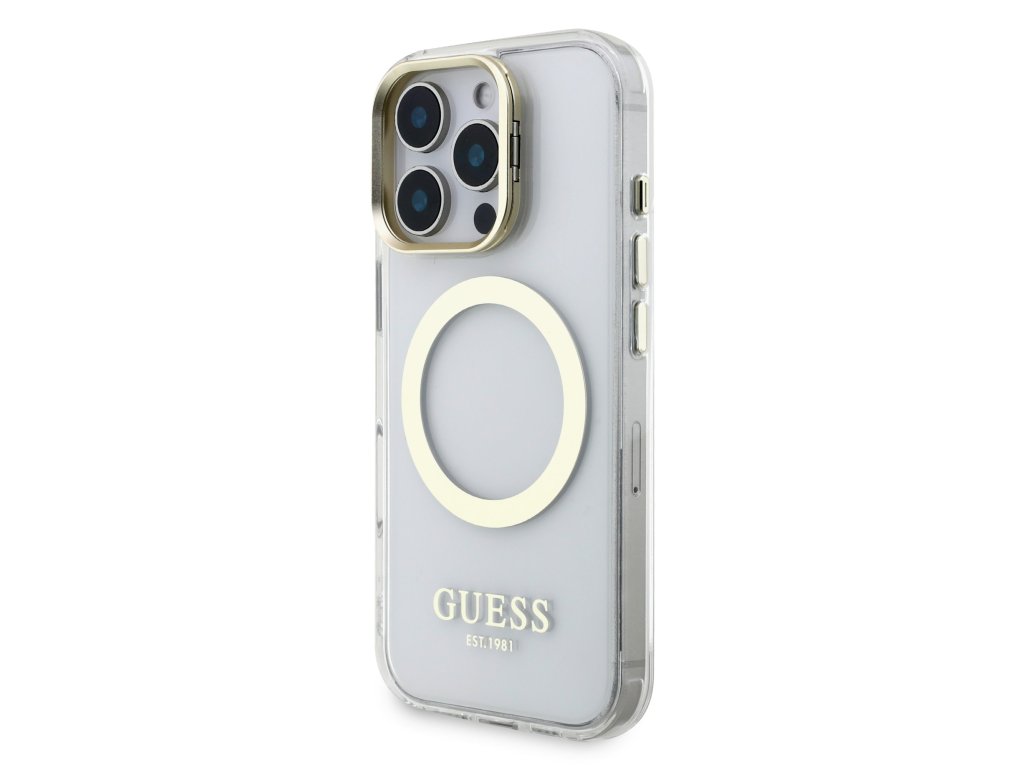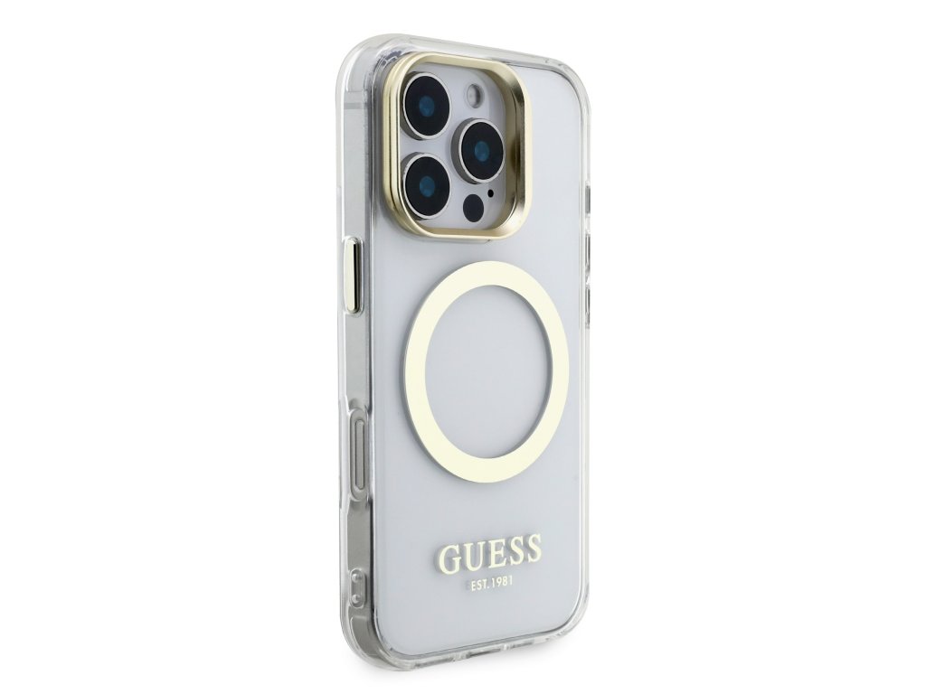 Guess IML Gold Outline Stand Camera Frame MagSafe Zadní Kryt pro iPhone 16 Pro Transparent