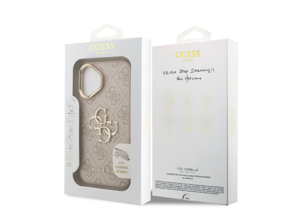 Prémiový zadní kryt Guess PU 4G Metal Logo Stand Camera Frame se vyznačuje elegantním, charakteristickým 4G vzorem, doplněným o logo GUESS.Kryt je vyrobený z lehkého a odolného polyuretanu (PU) s povrchovou úpravou z PU kůže a nabízí tak nejen skvělou ochranu telefonu, ale také pohodlí při používání.