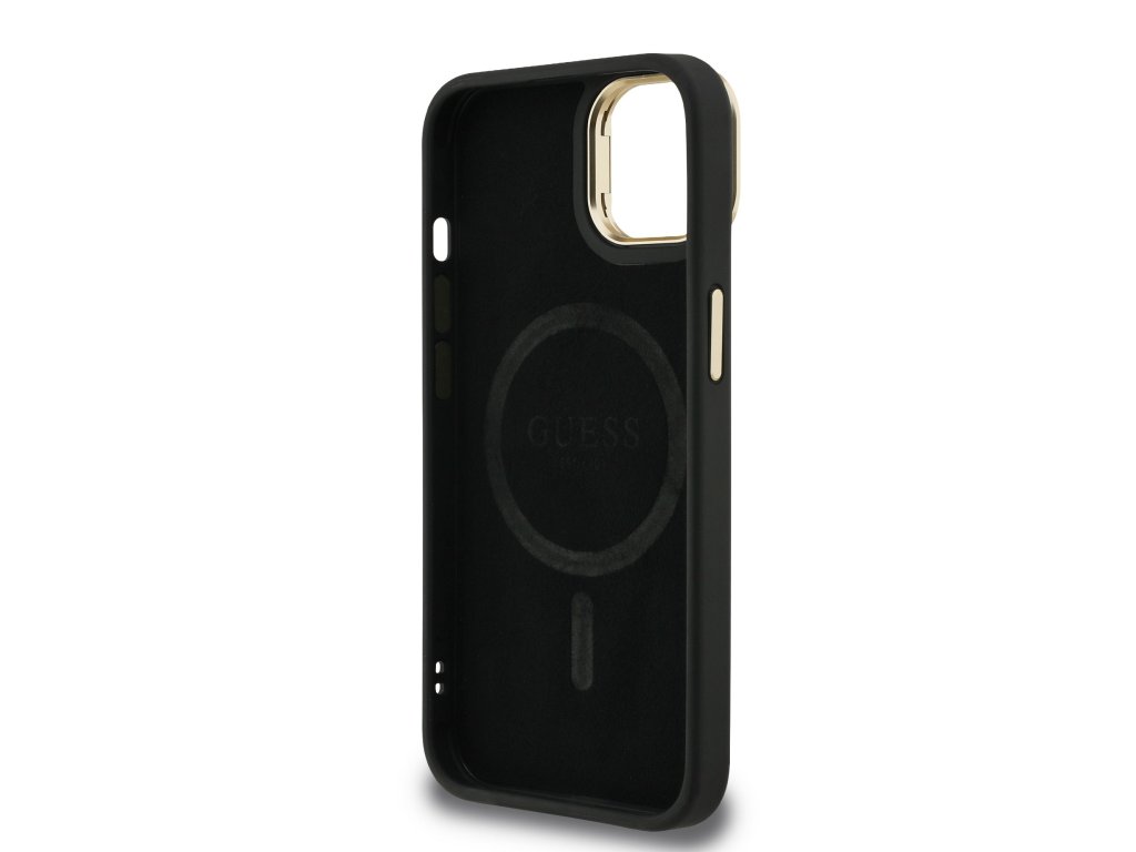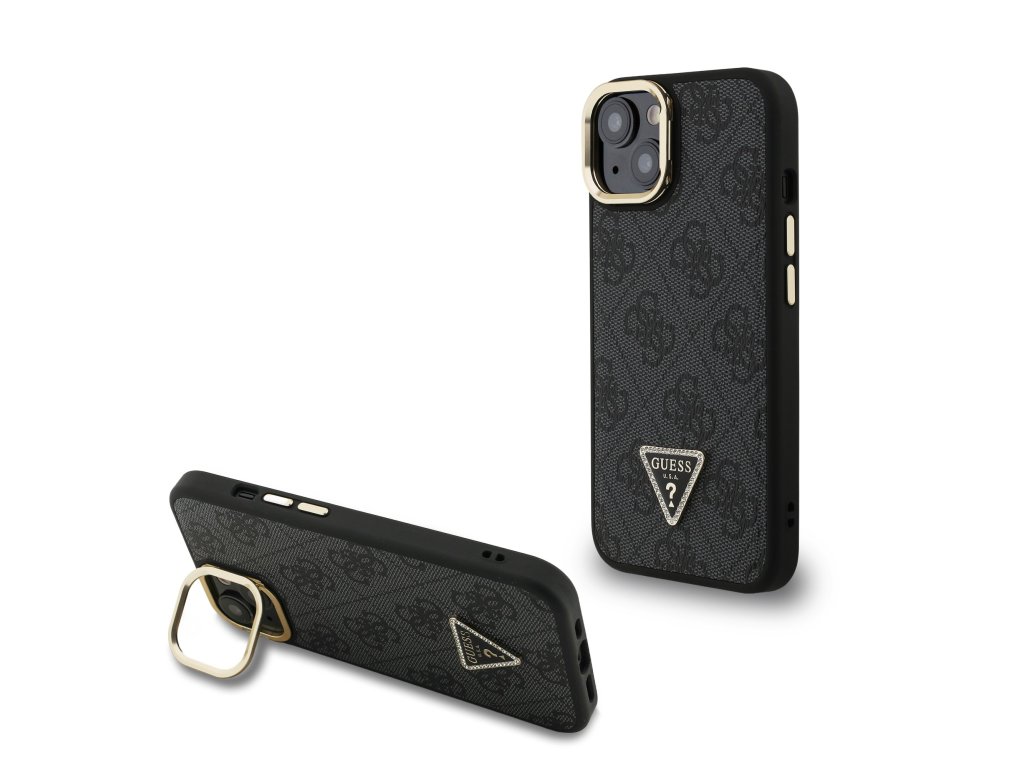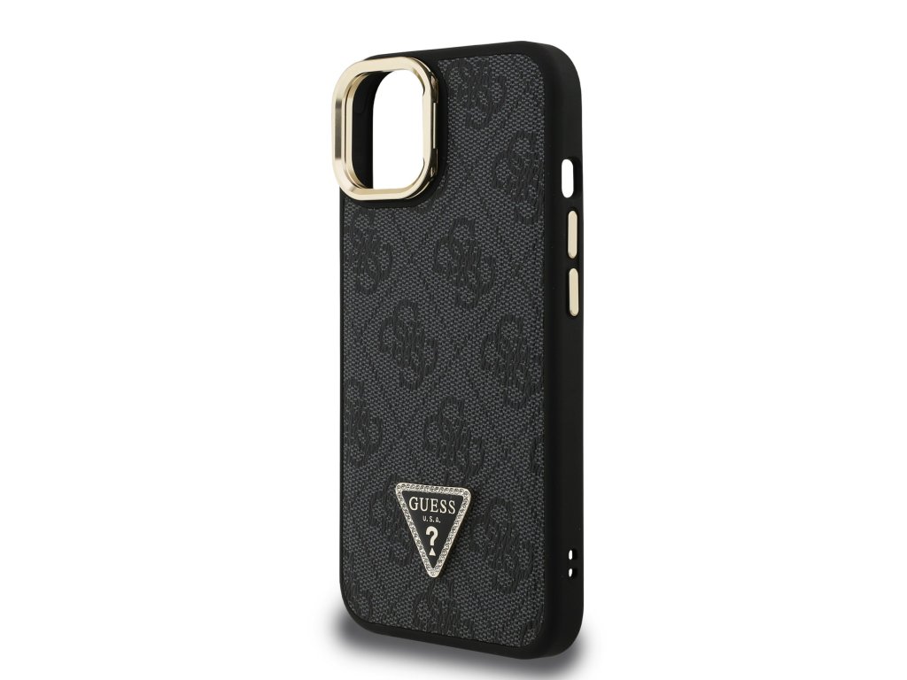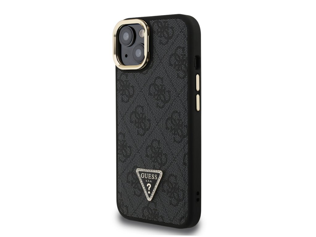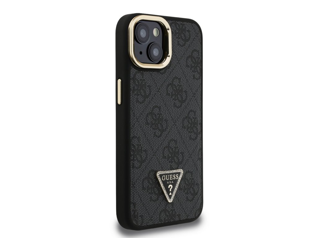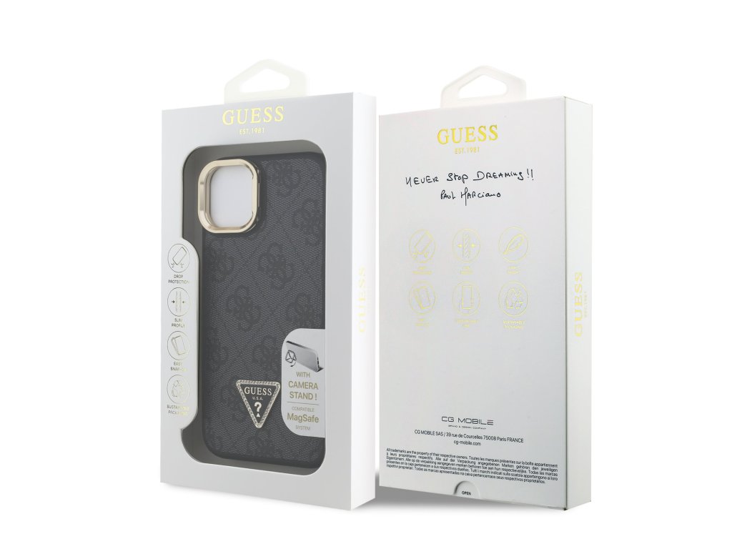 Guess PU 4G Strass Triangle Logo Stand Camera Frame MagSafe Zadní Kryt pro iPhone 14 Black