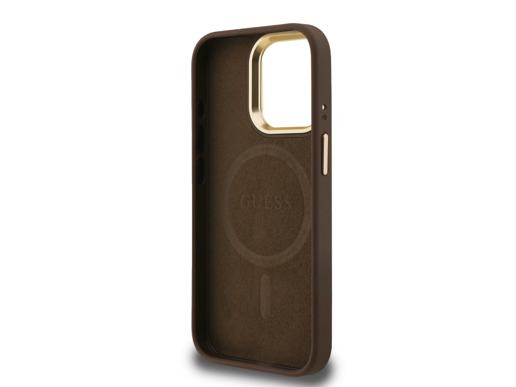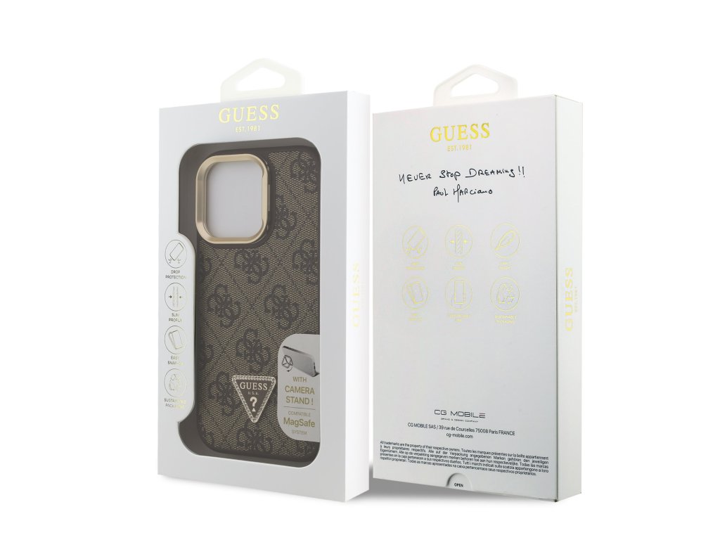 Guess PU 4G Strass Triangle Logo Stand Camera Frame MagSafe Zadní Kryt pro iPhone 15 Pro Brown