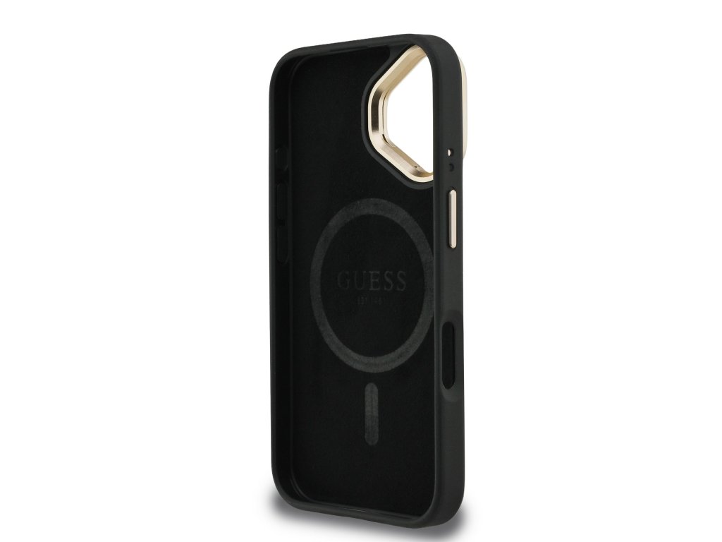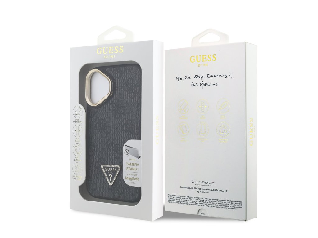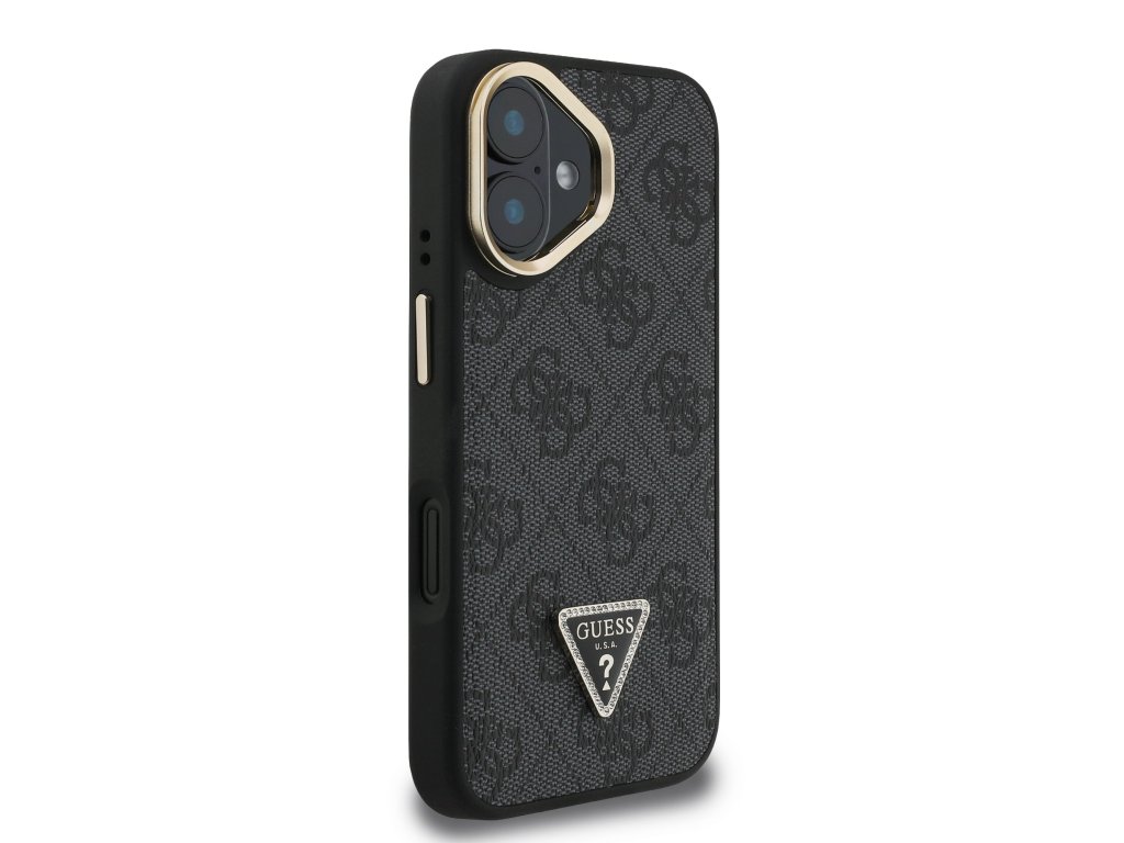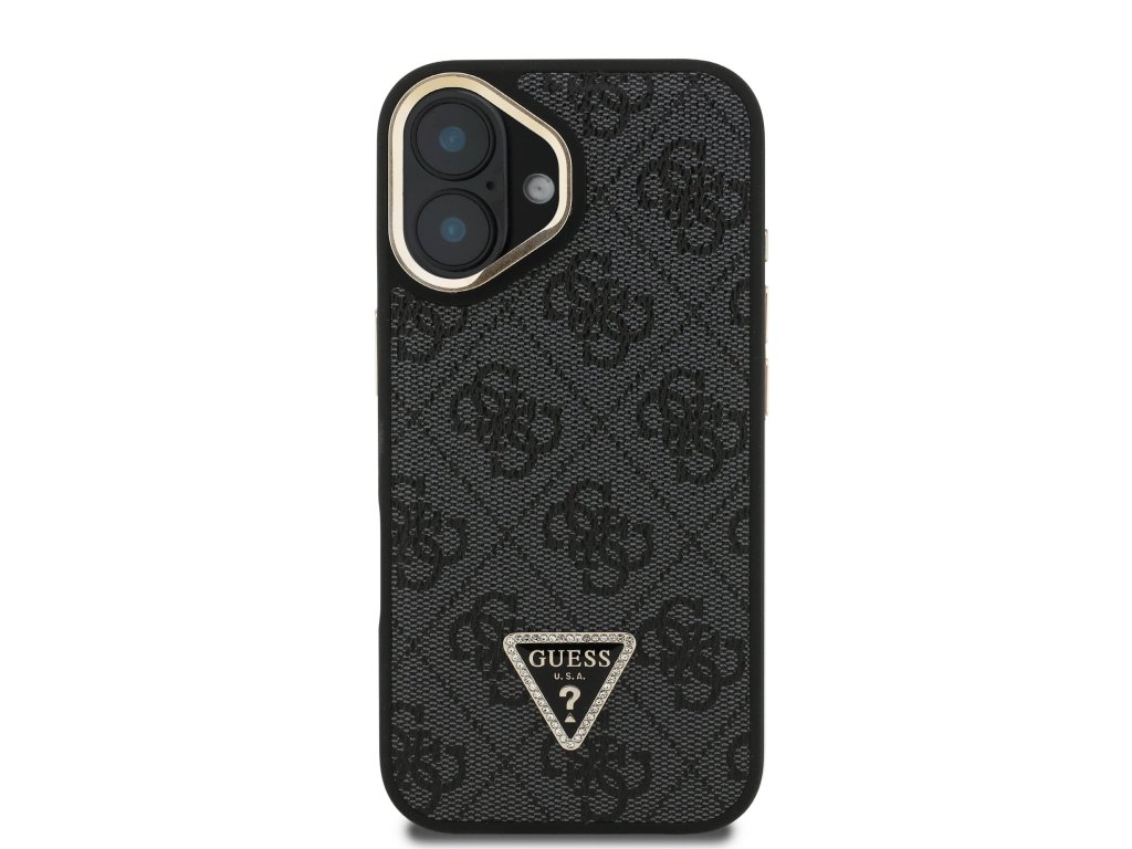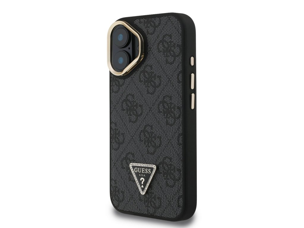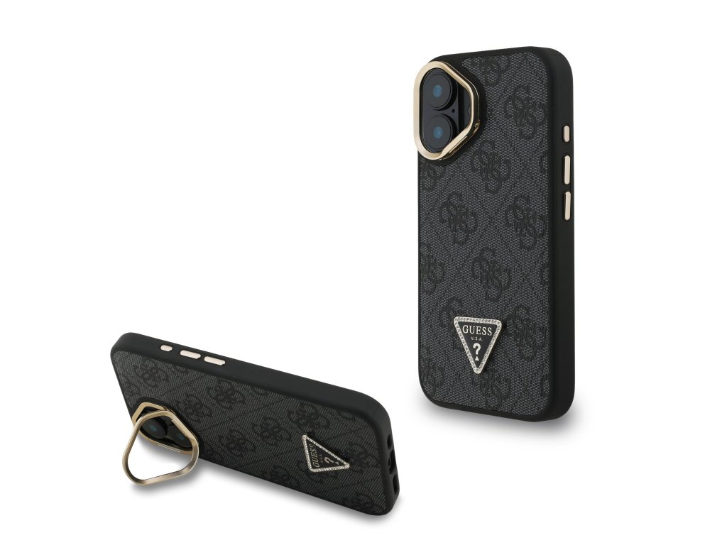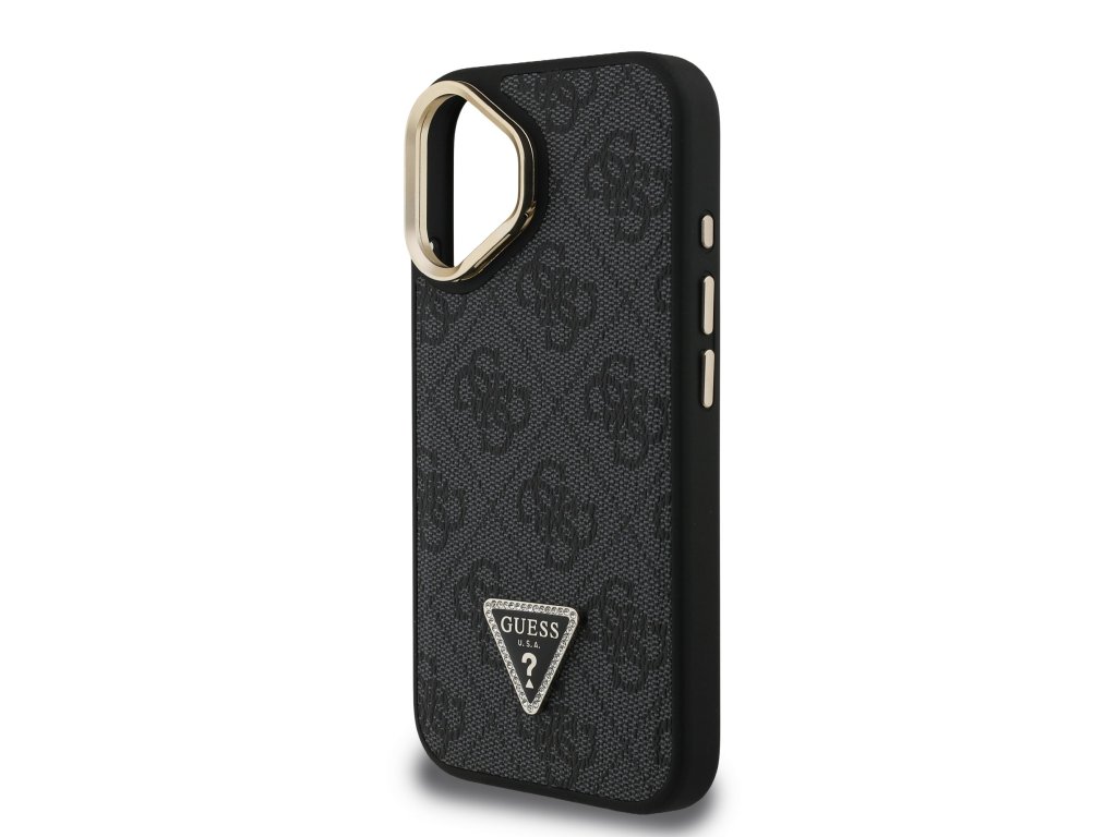 Guess PU 4G Strass Triangle Logo Stand Camera Frame MagSafe Zadní Kryt pro iPhone 16 Black