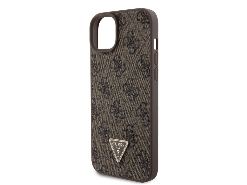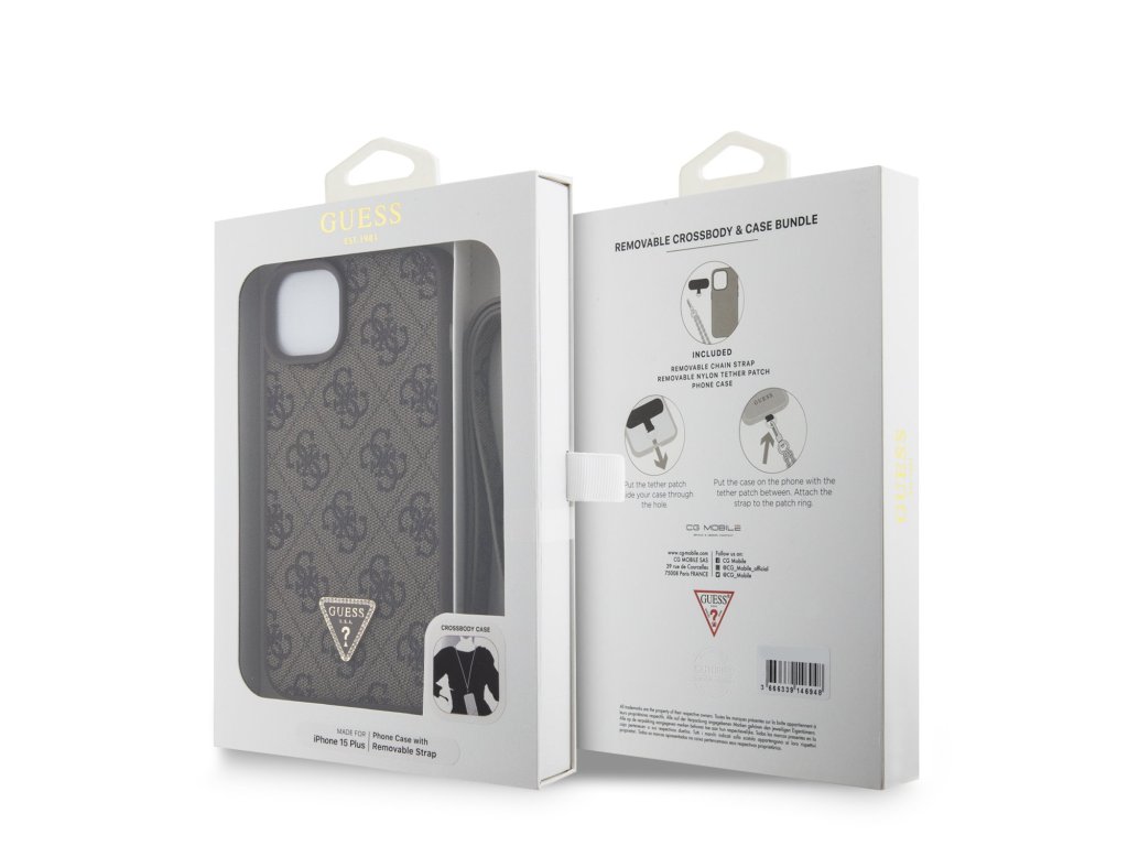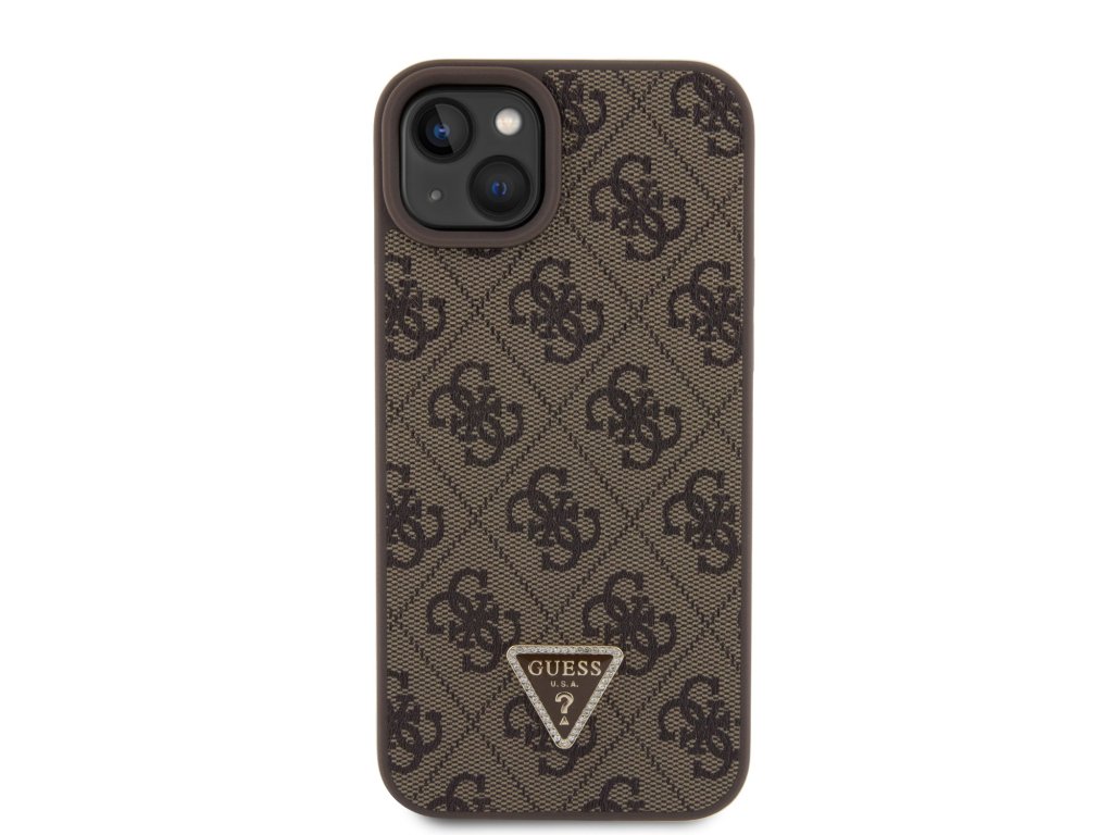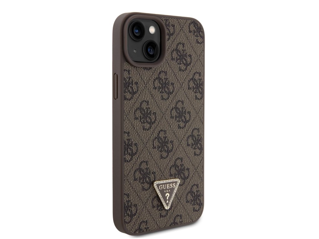 Guess PU 4G Strass Triangle Metal Logo Zadní Kryt + Crossbody Popruh pro iPhone 15 Plus Brown