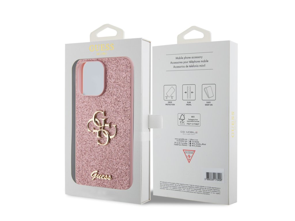 Guess PU Fixed Glitter 4G Metal Logo kryt je perfektním módním doplňkem a zároveň spolehlivou ochranou vašeho telefonu.