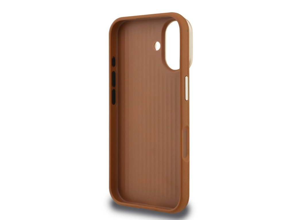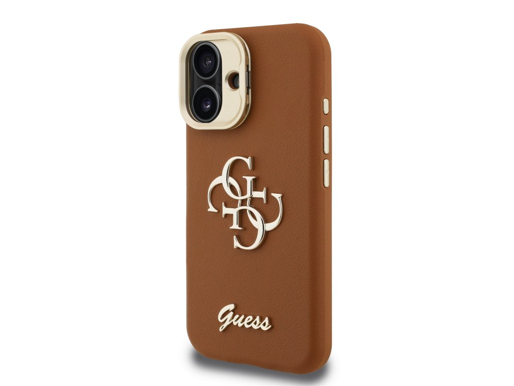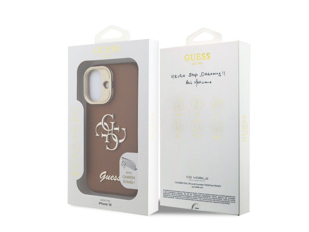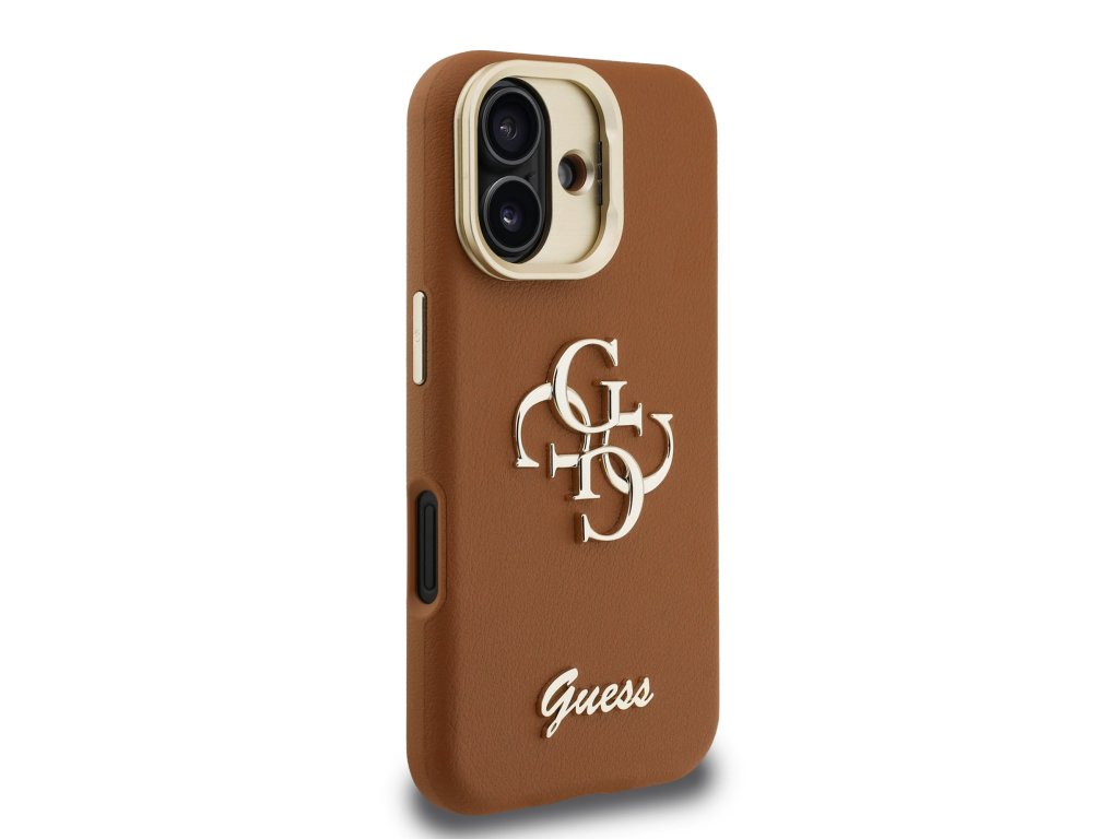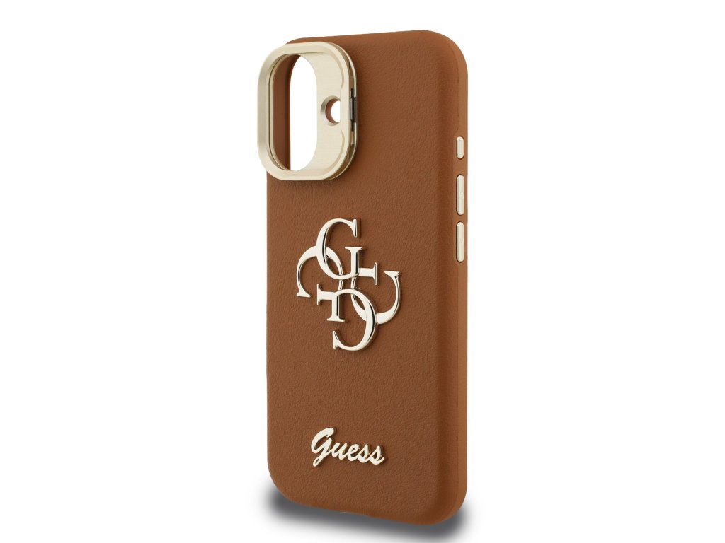 Guess PU Grained 4G Logo Stand Camera Frame Zadní Kryt pro iPhone 16 Brown