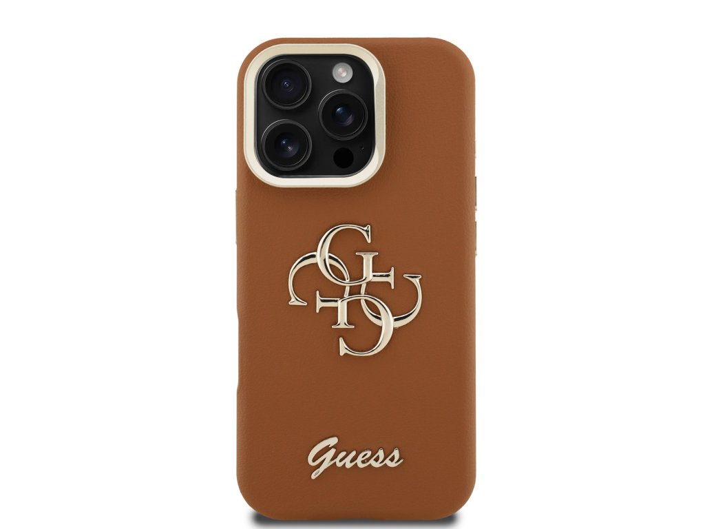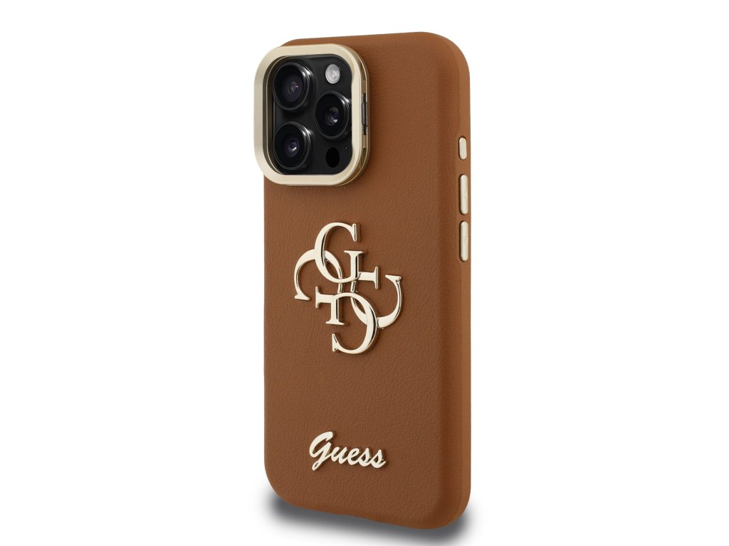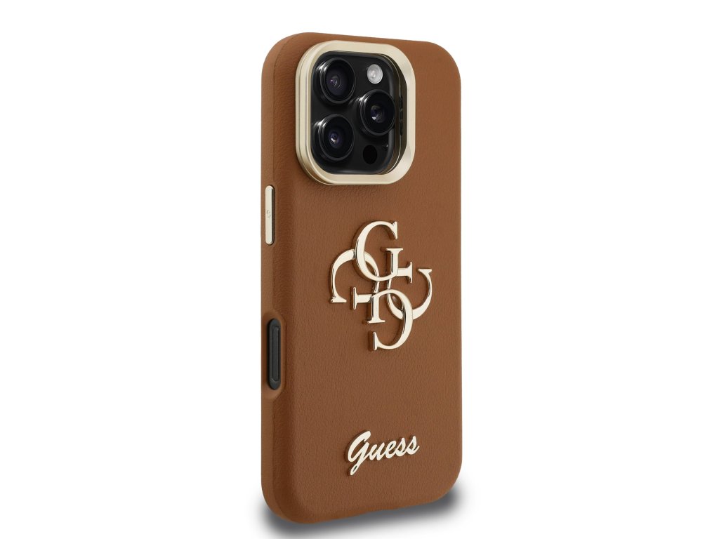 Guess PU Grained 4G Logo Stand Camera Frame Zadní Kryt pro iPhone 16 Pro Max Brown