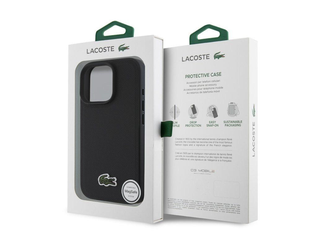 Lacoste Iconic Petit Pique Woven Logo MagSafe zadní kryt je dokonalý doplněk pro váš telefon i váš outfit, který kombinuje funkčnost a styl v jednom.Je vyrobený z lehké a odolného PU materiáliu a nabízí skvělou ochranu a pohodlí při používání. Vnitřní výstelka z jemného mikrovlákna zajišťuje, že váš telefon bude chráněn před poškrábáním a drobnými poškozeními.