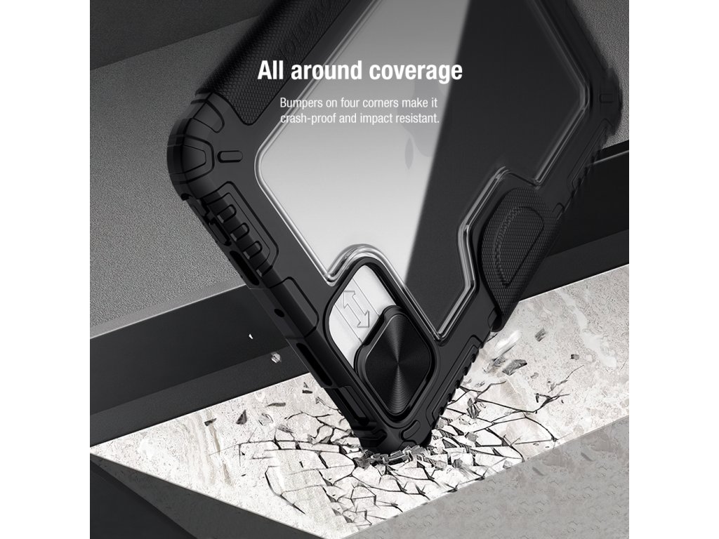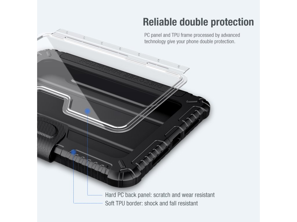 Nillkin Bumper Pro ochranné pouzdro s praktickým flipem, který slouží zároveň jako stojánek je vyrobeno z vybraného materiálu TPU a PC.Čočka fotoaparátu je chráněna posuvným krytem