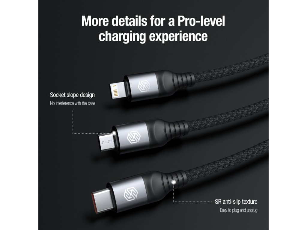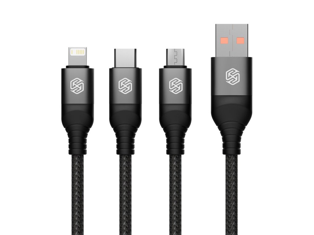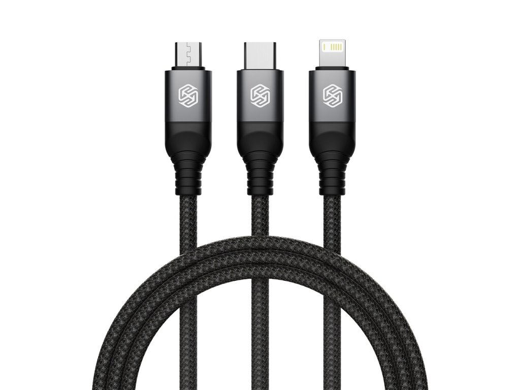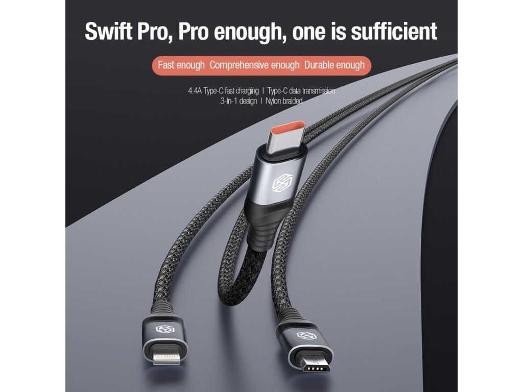 Nillkin Kabel Swift Pro 3v1 pro nabíjení zařízení USB-C, Lightning a microUSB z USB konektoru nabíječky nebo notebooku, nabíječky nebo konektoru notebooku.Kabel je opletený pro maximální pevnost a dlouhou životnost a nadstandartní 1.5 m délkou.