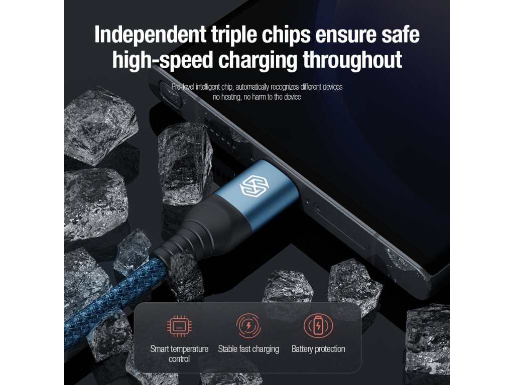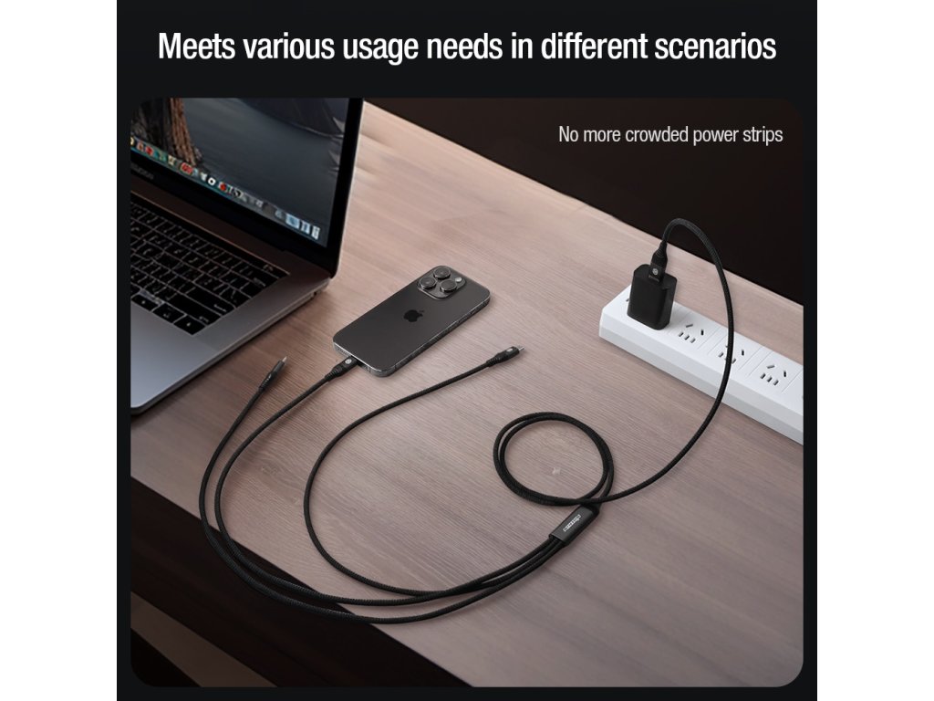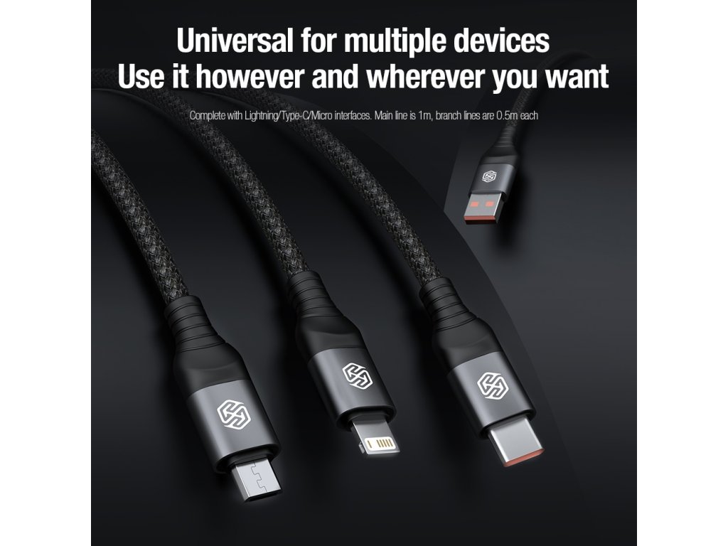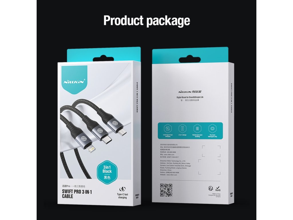 Nillkin Kabel Swift Pro 3v1 pro nabíjení zařízení USB-C, Lightning a microUSB z USB konektoru nabíječky nebo notebooku, nabíječky nebo konektoru notebooku.Kabel je opletený pro maximální pevnost a dlouhou životnost a nadstandartní 1.5 m délkou.