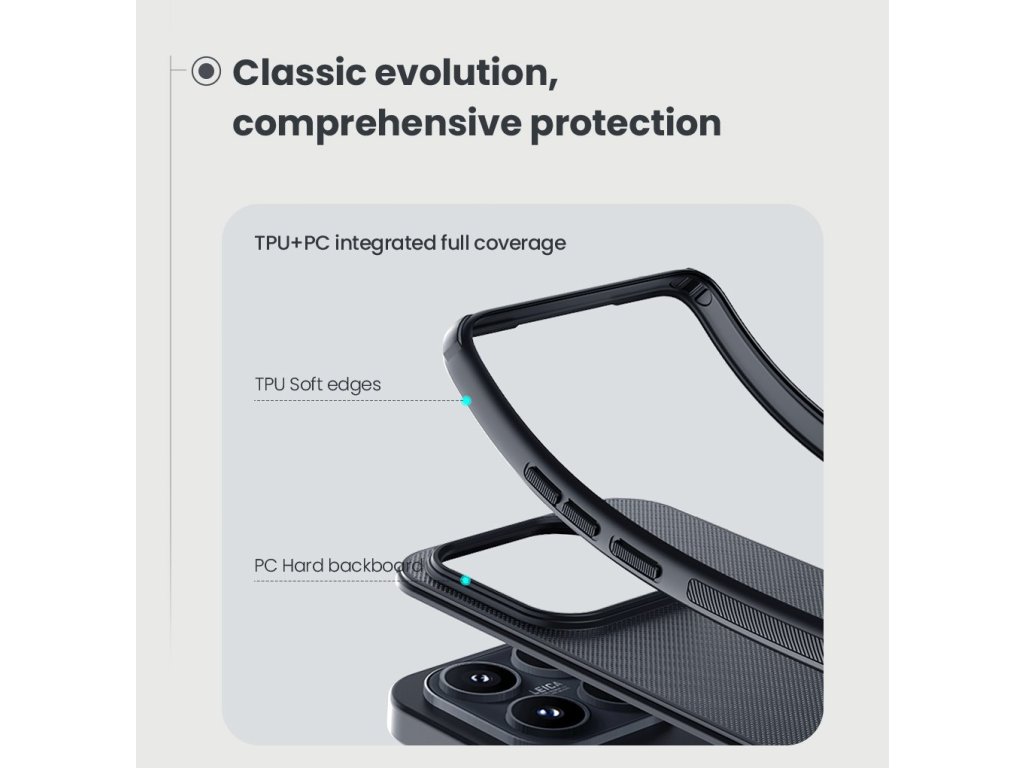Skládá se z tvrdého a odolného plastu na zadní straně a TPU měkkého plastu na bocích.